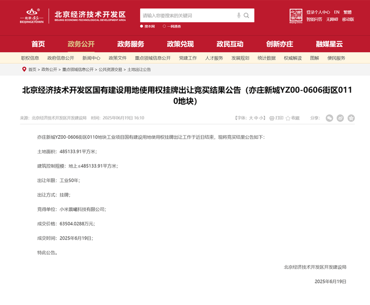 小米汽车在业界总是话题不断,近期又有了新的动态。据悉,小米景曦科技有限公司斥资6.35亿元人民币,在北京经济技术开发区成功竞得一宗工业用地,地块总面积达到48.5万平方米,使用年限长达50年。此地块紧邻小米汽车在北京的第一、第二工厂,因此业界普遍猜测,这或是小米汽车三期工厂项目的用地。